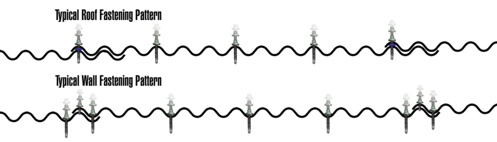 Fasteners are to be applied at the top of the corrugation, every third ridge, attached to each purlin as often as is required. Please note that it is the responsibility of the builder to ensure that purlins are adequately spaced to meet specific engineering requirements.